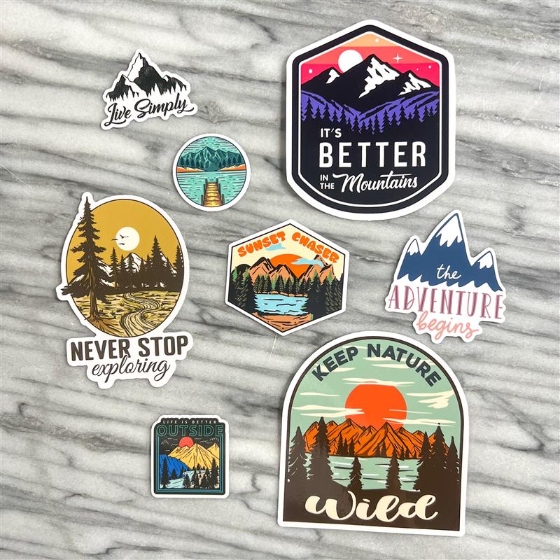 Bring adventure everywhere you go with this Outdoor & Mountains Sticker Bundle! Featuring 3 small, 2 medium, and 3 large vinyl stickers, each design captures the thrill of the great outdoors. Perfect for decorating your water bottle, laptop, or gear, these durable stickers add a playful touch of nature to your everyday items. Stick on some mountain magic and let your wild side shine!