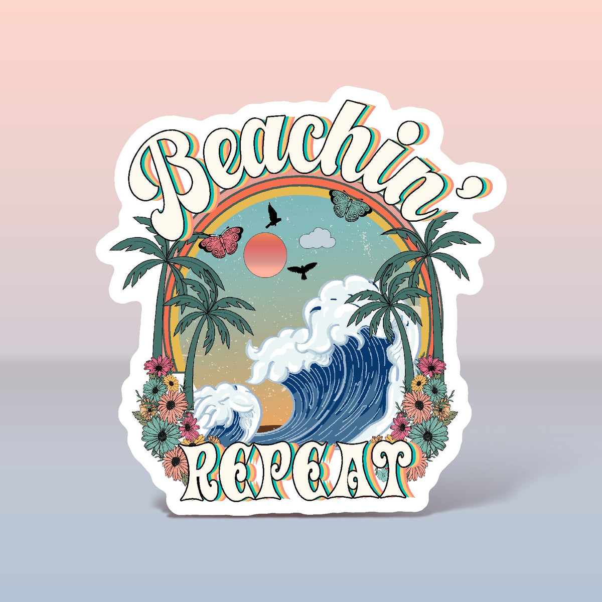 BEACHIN' REPEAT OCEAN WAVES, PALM TREES, FLOWERS