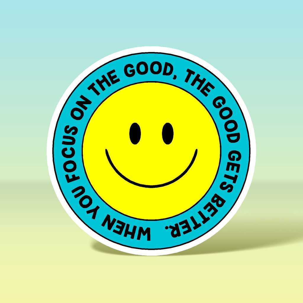 WHEN YOU FOCUS ON THE GOOD, THE GOOD GETS BETTER YELLOW/TEAL SMILEY FACE